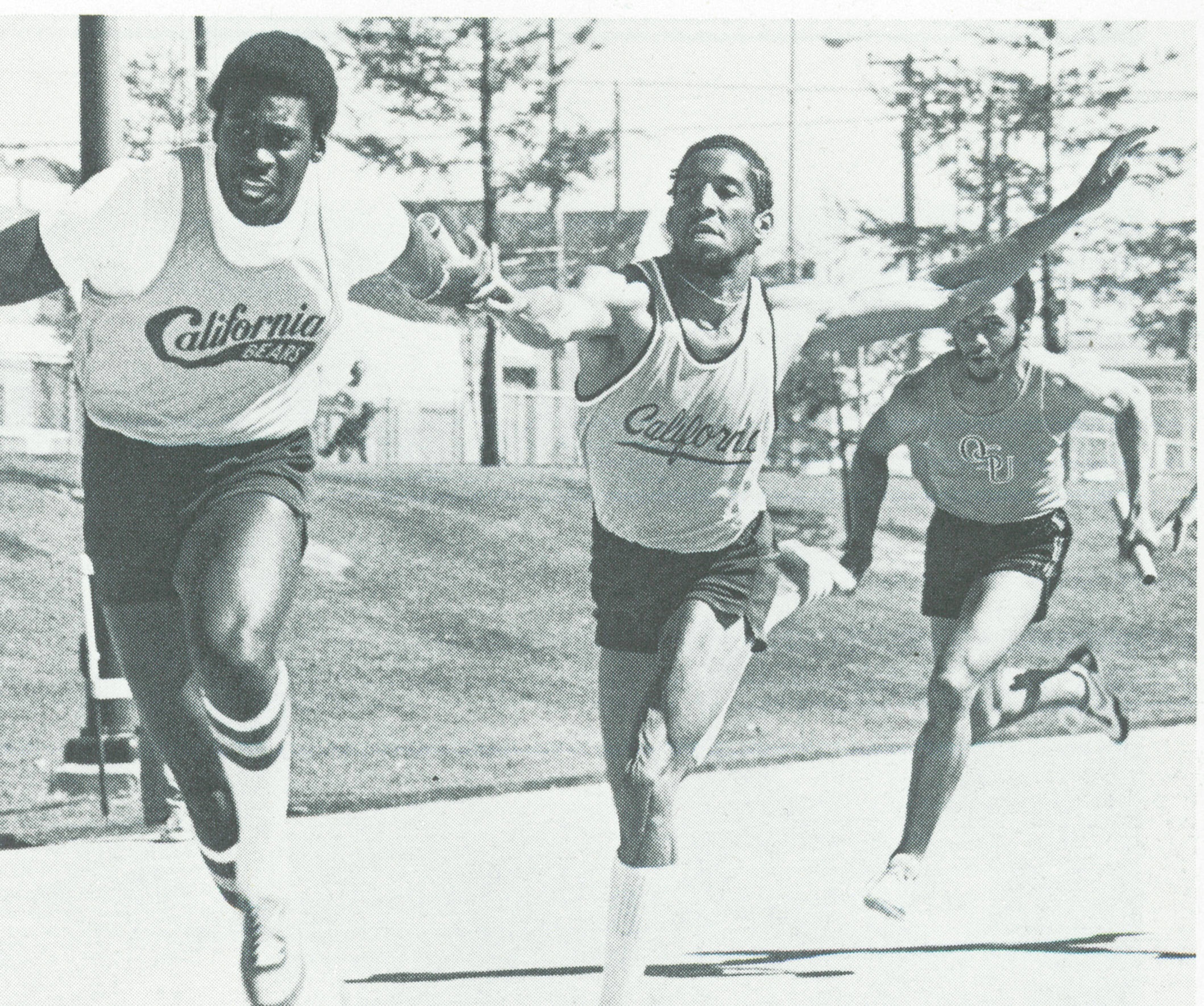 From 1977 where Carl Florant (Berkeley/Paly'73) is in full flight handing off to Keith Taylor in the 4x1. Carl is still ranked #11 with his 13.6h (13.93c) time in the 110HH on the All-Time CCS list.