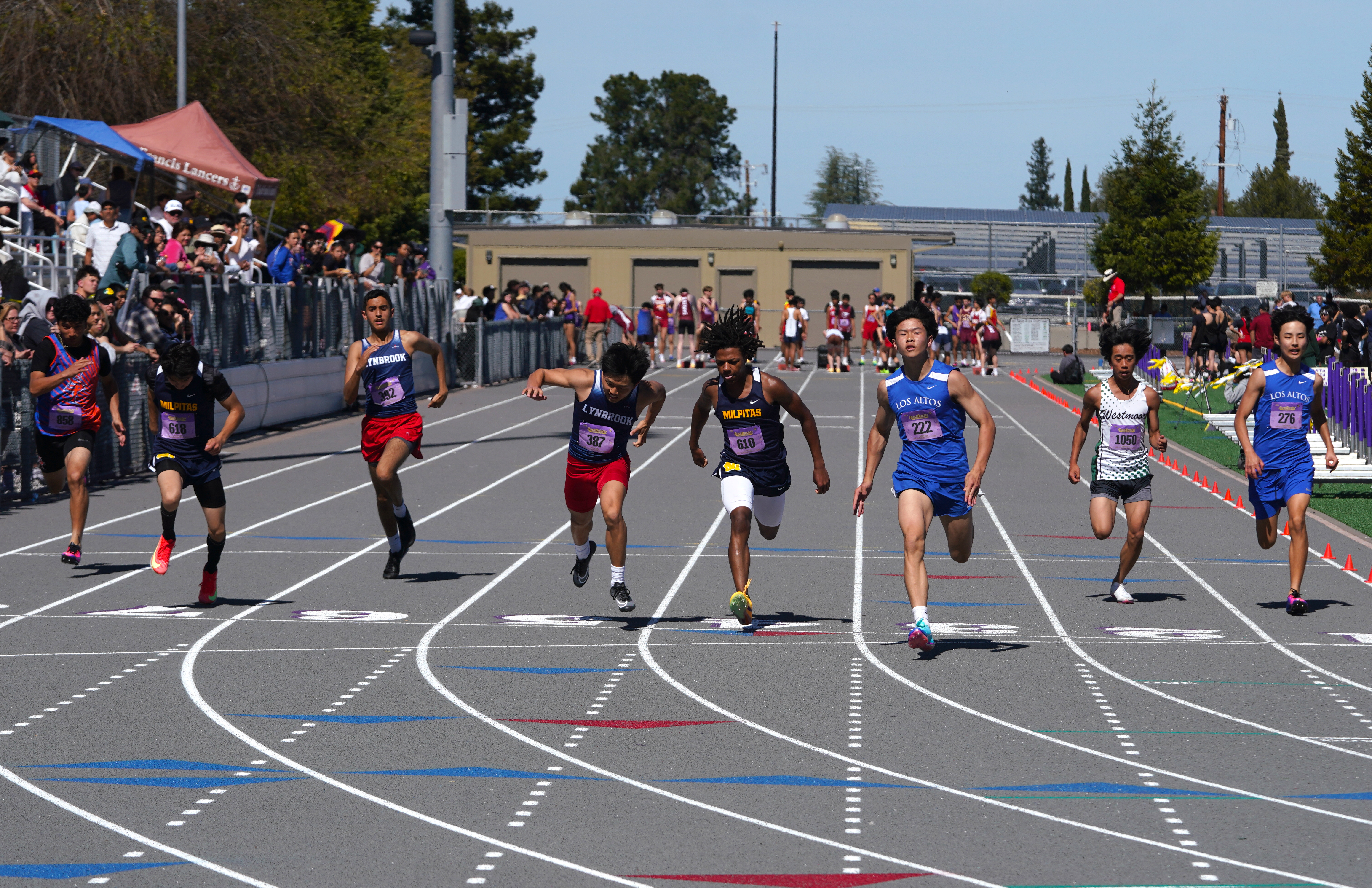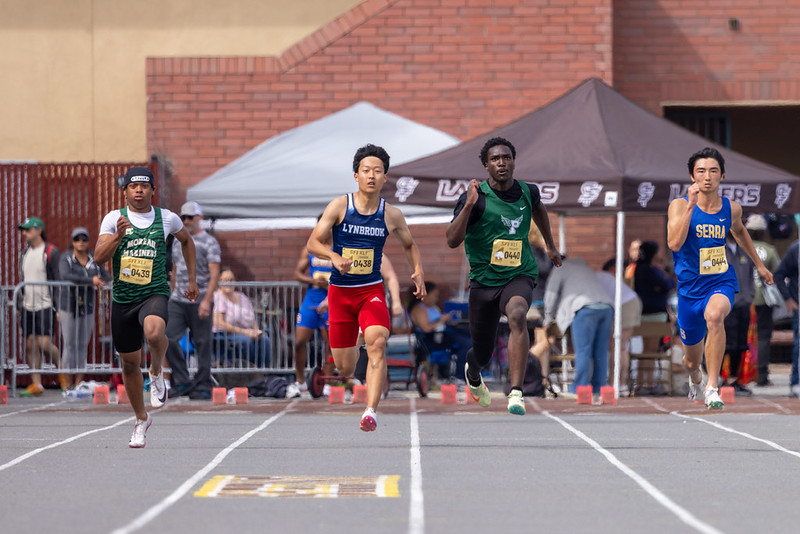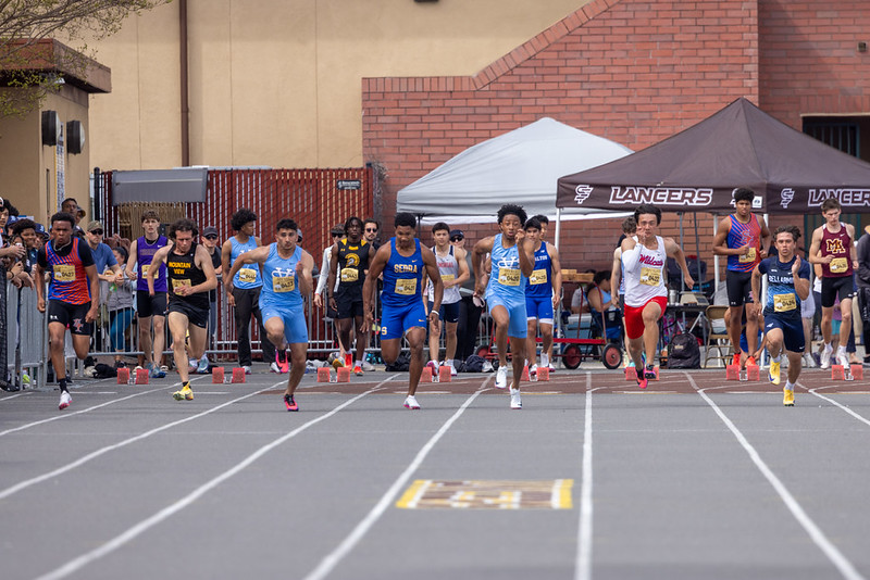 The best weather the RustBuster Invite has ever had! Boys 100 saw some great early season marks while Amaya Bharadwaj (Paly) breaks the stadium record in the 3200 by 36 seconds with a 10:20.52 clocking. Pictures thanks to "The Duke" & Malcolm Slaney.